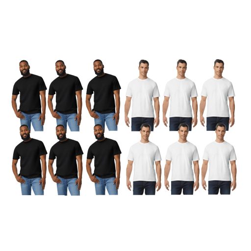 Gildan kereknyakú, körkötött rövid ujjú férfi pamut póló 12 db-os csomagban. Válla és nyakrésze szalaggal megerősítve, az alja és az ujja duplaöltéssel szegve. A nyakánál rugalmas bordás passzé.