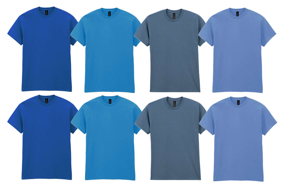 8 db-os, 4 színes csomagban Gildan kereknyakú pamut póló, Carolina Blue, Royal, Indigo Blue, Sapphire-4XL
