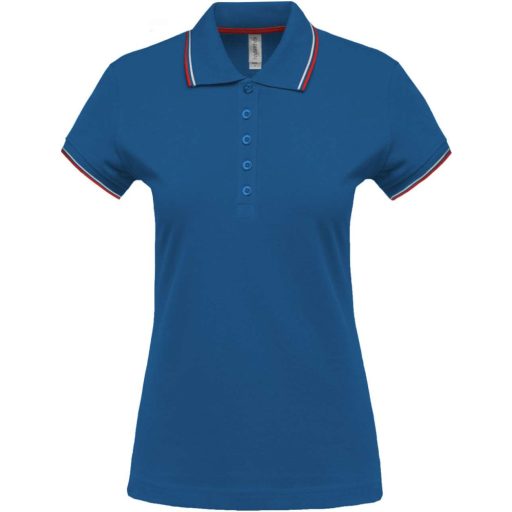 Női kontrasztcsíkos rövid ujjú galléros piké póló, Kariban KA251, Light Royal Blue/Red/White-L