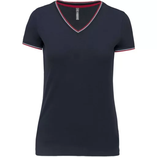 Női V-nyakú piké póló, csíkos szélekkel, Kariban KA394, Navy/Red/White-M