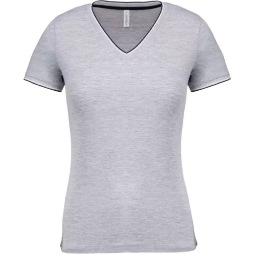 Női V-nyakú piké póló, csíkos szélekkel, Kariban KA394, Oxford Grey/Navy/White-2XL