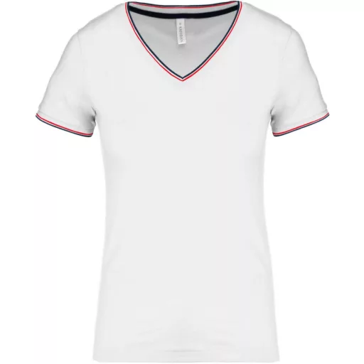 Női V-nyakú piké póló, csíkos szélekkel, Kariban KA394, White/Navy/Red-S