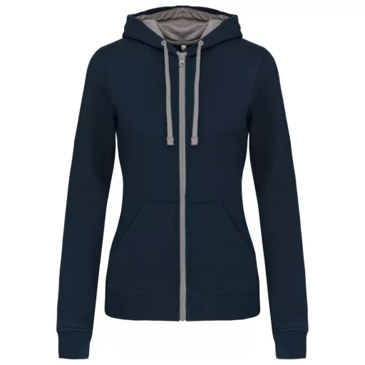 Női cipzáras pulóver kontrasztos bélésű kapucnival, Kariban KA467, Navy/Fine Grey-M