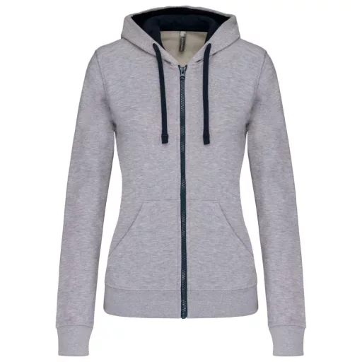 Női cipzáras pulóver kontrasztos bélésű kapucnival, Kariban KA467, Oxford Grey/Navy-S