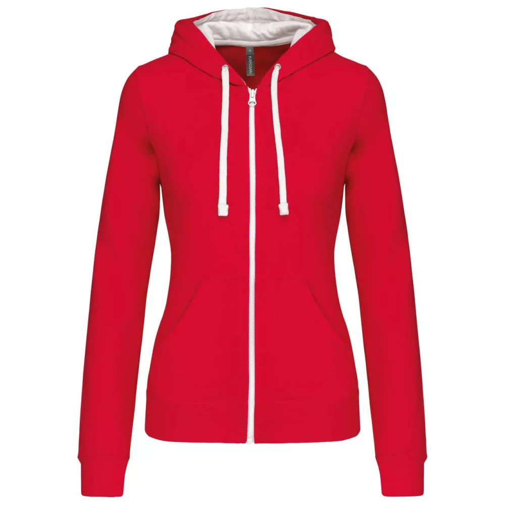 Női cipzáras pulóver kontrasztos bélésű kapucnival, Kariban KA467, Red/White-XL