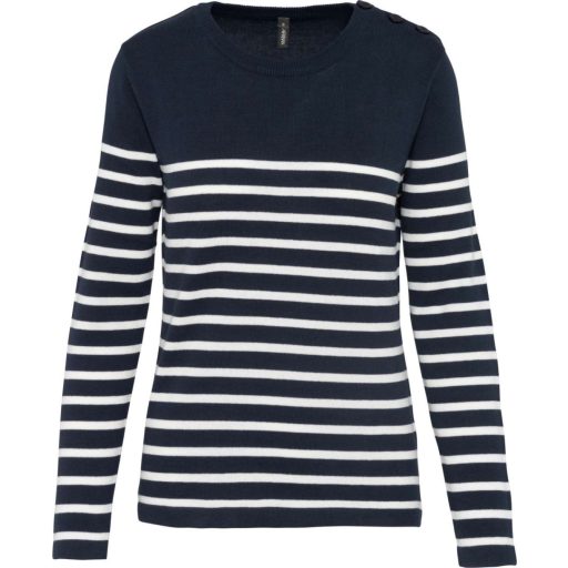 Női vállon gombolós csíkos pulóver, Kariban KA990, Striped Navy/Off White-M